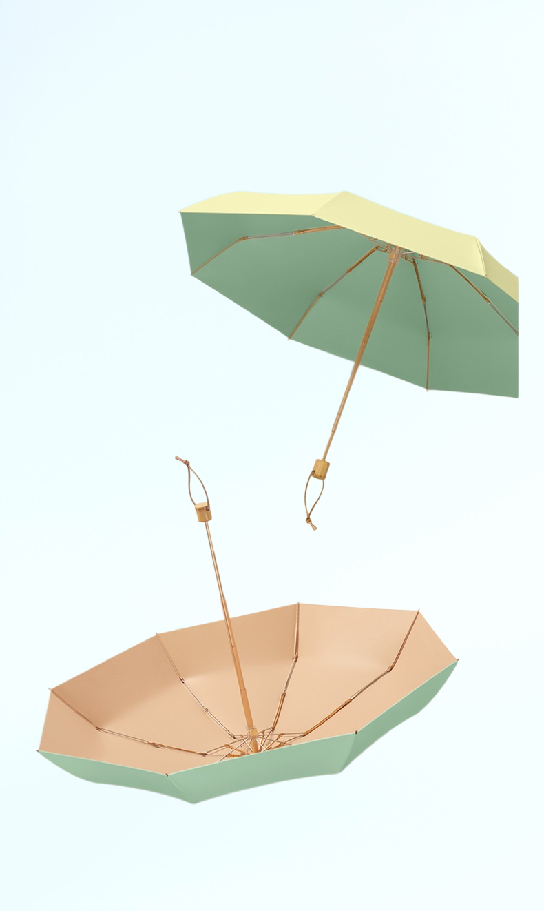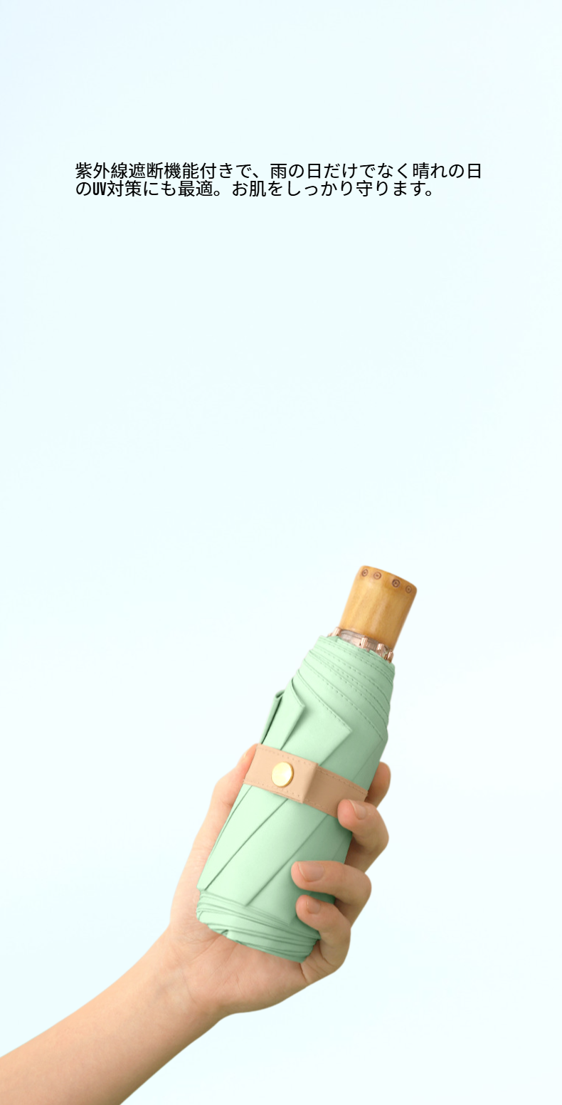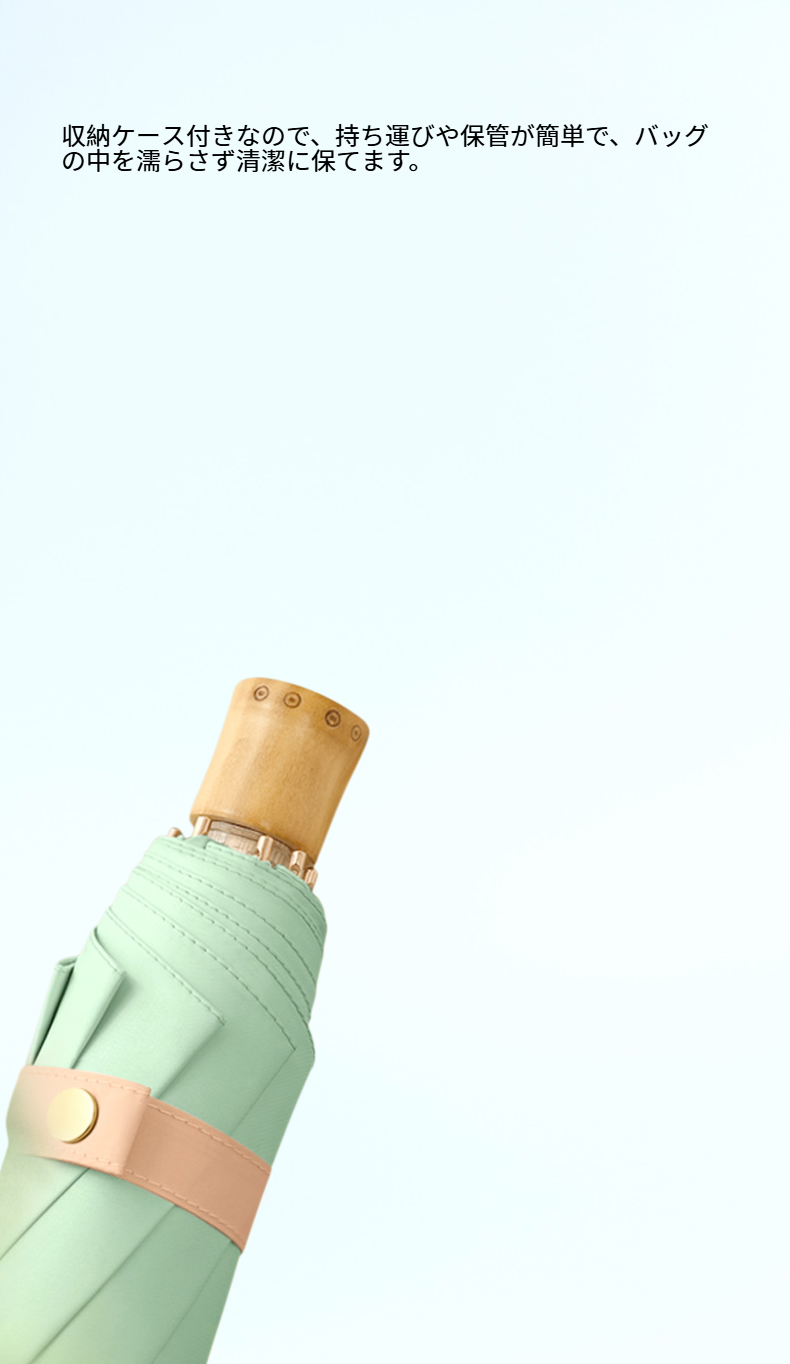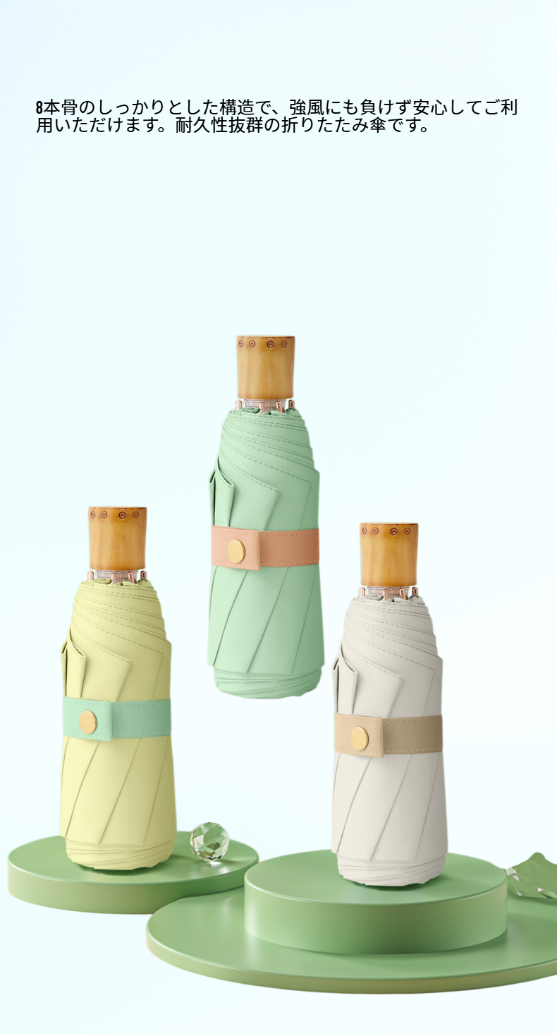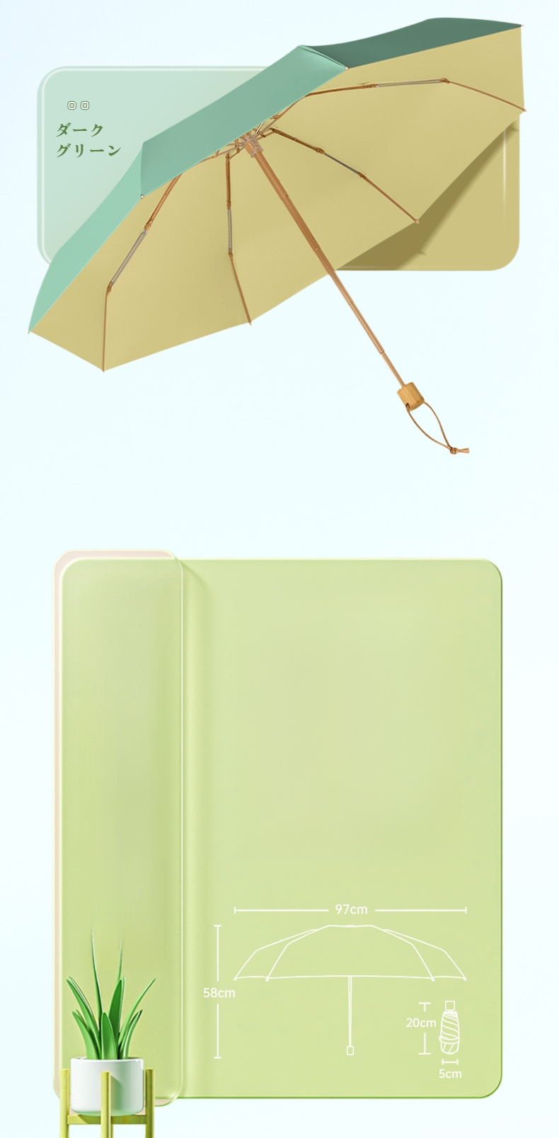 色:8本骨・五つ折り・カラービニール・木製ハンドル 外側グリーン/内側ブラウン、8本骨・五つ折り・カラービニール・木製ハンドル 外側イエロー/内側グリーン、8本骨・五つ折り・カラービニール・木製ハンドル 外側ホワイト/内側ライトブラウン、8本骨・五つ折り・カラービニール・木製ハンドル 外側ブルー/内側ピンク