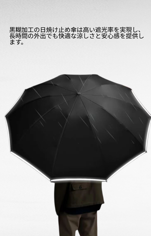● 黒糊加工の日焼け止め傘は高い遮光率を実現し、長時間の外出でも快適な涼しさと安心感を提供します。